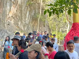 ระหว่างนั้นมีนักท่องเที่ยวกลุ่มหนึ่งได้มาไหว้ฟ้าดิน ผูกผ้าแดงที่เสาทีกง ไหว้อากงเห้งเจีย แล้วได้ลุ้นล้วงไหหยิบลูกปิงปอง ได้ลูกปิงปองหมายเลข 4,6,0 โดยจะนำไปเสี่ยงโชคปีใหม่นี้ เผยตั้งใจมาไหว้มาขอโชค