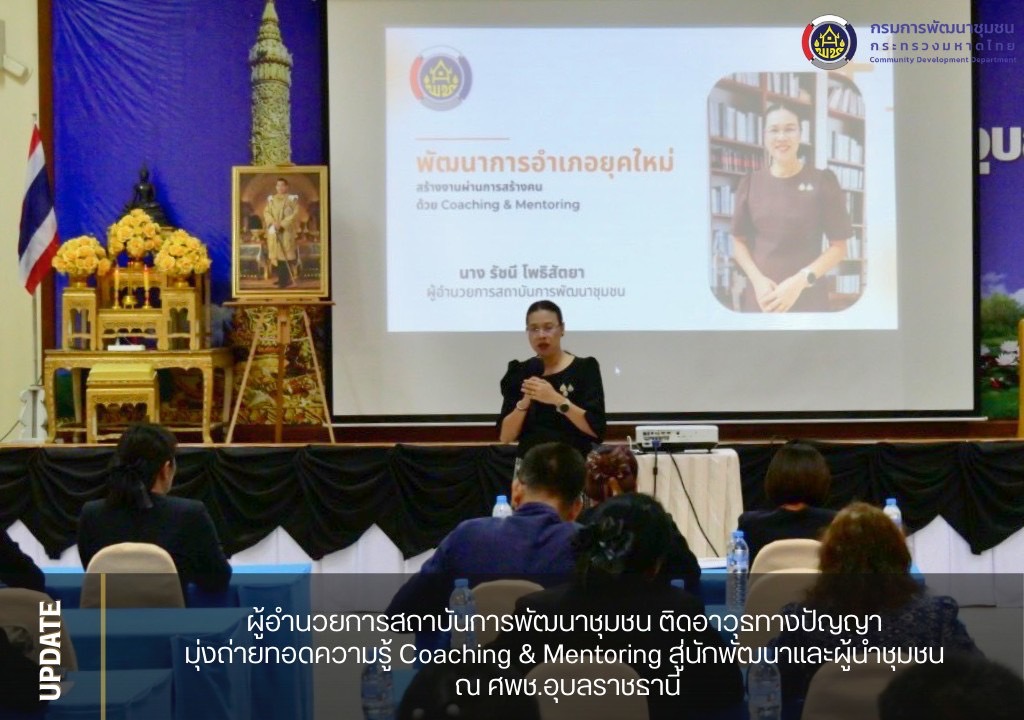 วันที่ 25 ธันวาคม 2568 เวลา 10.00 น. ณ หอประชุมค้ำคูณ ศูนย์ศึกษาและพัฒนาชุมชนอุบลราชธานี นายสยาม ศิริมงคล อธิบดีกรมการพัฒนาชุมชน มอบหมายให้ นางรัชนี โพธิสัตยา ผู้อำนวยการสถาบันการพัฒนาชุมชน เป็นวิทยากรบรรยาย หัวข้อ Coaching & Mentoring โครงการเพิ่มประสิทธิภาพการตรวจรายการและสนับสนุนหน่วยรับตรวจในการขับเคลื่อนงานตามแผนปฏิบัติราชการกรมการพัฒนาชุมชมชน กิจกรรมที่ 2 การพัฒนากลไกการตรวจรายการแบบมีส่วนร่วมกับภาคีเครือข่ายการพัฒนา เพื่อสนับสนับสนุน ขับเคลื่อนนโยบายและแผนปฏิบัติราชการกรมการพัฒนาชุมชน