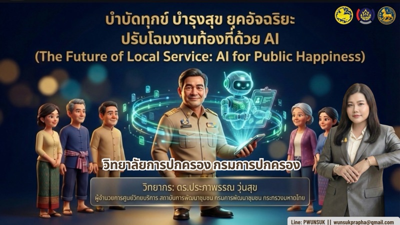 ผอ.ประภาพรรณ บรรยายในหัวข้อ “บำบัดทุกข์ บำรุงสุข ยุคอัจฉริยะ: ปรับโฉมงานท้องที่ด้วย AI (The Future of Local Service: AI for Public Happiness)” เพื่อปลดล็อกศักยภาพและเปิดมุมมองใหม่ให้แก่ผู้นำท้องที่ โดยชี้ให้เห็นถึงความสำคัญของการนำเทคโนโลยีปัญญาประดิษฐ์ (AI) เข้ามาพลิกโฉมการทำงานของฝ่ายปกครอง ทั้งในด้านการจัดการข้อมูล การสื่อสาร การแจ้งเตือนภัย การทำแผนหมู่บ้าน และการแก้ปัญหาในพื้นที่ ซึ่งจะช่วยเพิ่มประสิทธิภาพการทำงานและการให้บริการประชาชนให้มีความรวดเร็วและแม่นยำมากยิ่งขึ้น