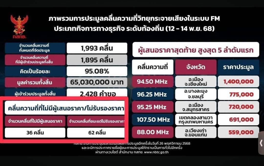 กสทช. ปิดประมูลคลื่นวิทยุ FM ท้องถิ่น 1,895 คลื่น มูลค่ารวม 65 ล้านบาท