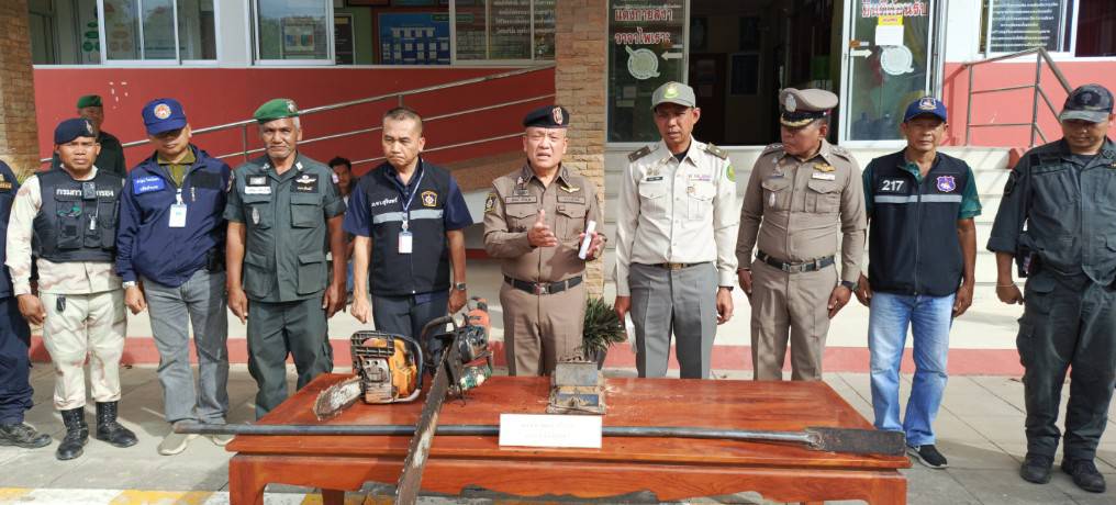 เลื่อยโซ่ดัดแปลง ใบเลื่อย 3 เส้น และเหล็กงัดไม้ ก่อนนำของดลางทั้งหมดมายัง สภ.สวาย