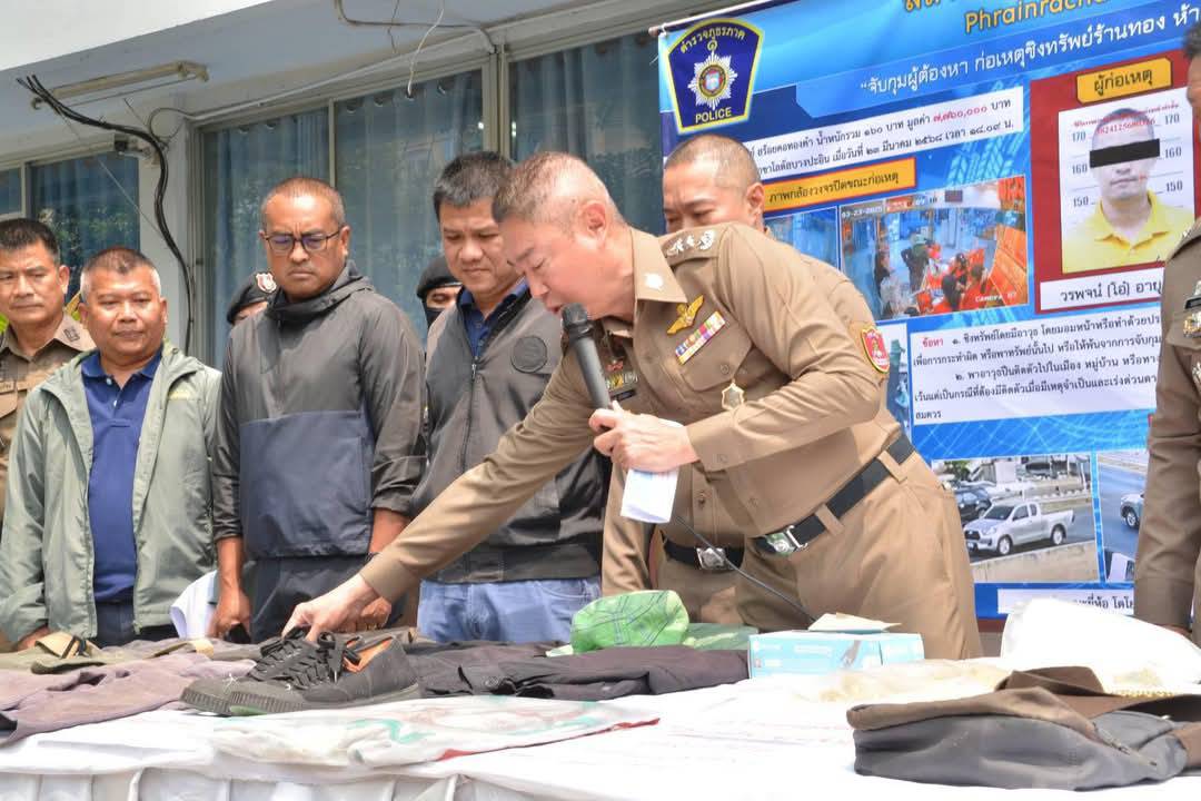 จากการสืบสวนสืบสวนหาข่าว รวมทั้งได้รับแจ้งข้อมูลเบาะแสจากประชาชน ทำให้ทราบว่า ก่อนลงมือก่อเหตุ คนร้ายได้ขับรถยนต์กระบะยี่ห้อโตโยต้า สีเทา ไปจอดทิ้งไว้ในบ้าข้างทางริมถนนสายเอเชีย ห่างจากห้างที่เกิดเหตุประมาณ 2 กม. และเดินเท้ามายังห้างแล้วลงมือก่อเหตุชิงทรัพย์ทองรูปพรรณจากร้านทองภายในห้างดังกล่าว หลังเกิดเหตุคนร้ายได้นั่งรถจักรยานยนต์รับจ้างไปยังจุดที่จอดรถทิ้งไว้ แล้วขับรถหลบหนีไปพักอาศัยอยู่ที่อาคารแห่งหนึ่ง ตั้งอยู่ที่เขตสายไหม กทม.ต่อมาในวันที่ 26 มีนาคม 2568 เวลาประมาณ 21.40 น. เจ้าหน้าที่ตำรวจนำโดย พล.ต.ต.วรชาติ แสนคำ ผบก.สส.ภ.1 ได้เข้าตรวจค้นภายในห้องพักที่คนร้ายพักอาศัยอยู่พบ นายพด (นามสมมติ) อายุ 44 ปี ซึ่งพักอาศัยอยู่ในห้อง เจ้าหน้าที่จึงทำการตรวจค้นโดยนายพด(นามสมมุติ)เป็นผู้นำการตรวจค้น ผลการตรวจค้นพบของกลางอยู่ภายในห้อง ดังนี้