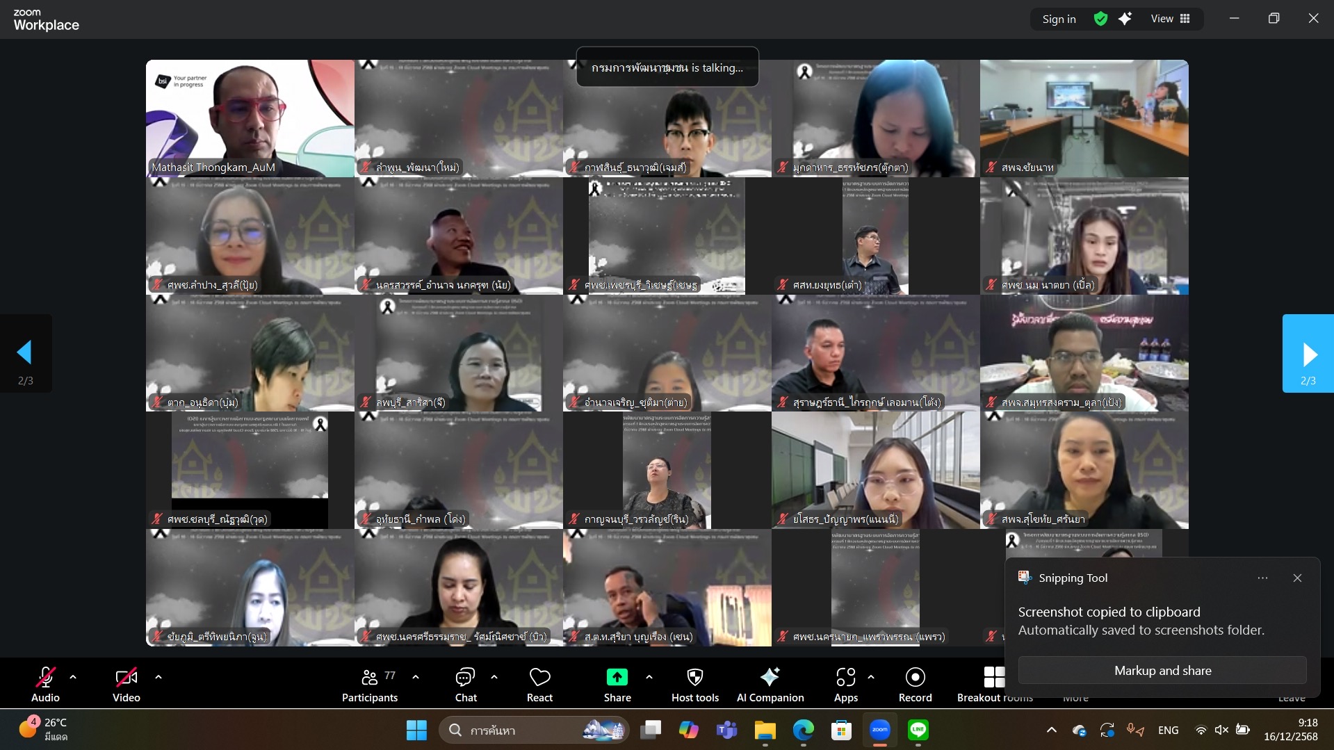 วันที่ 16 ธันวาคม 2568 เวลา 09.00 น. ณ ห้องประชุม War room ชั้น5 กรมการพัฒนาชุมชนนายสยาม ศิริมงคล อธิบดีกรมการพัฒนาชุมชน มอบหมายให้ นางรัชนี โพธิสัตยา ผู้อำนวยการสถาบันการพัฒนาชุมชน เป็นประธานพิธีเปิดโครงการพัฒนามาตรฐานระบบการจัดการความรู้สากล (ISO) กิจกรรมที่ 1 ฝึกอบรมหลักสูตรมาตรฐานระบบการจัดการความรู้สากล รูปแบบออนไลน์ผ่านระบบ Zoom Cloud Meetings โดยมีนายอำนาจ สุดสวาท ผู้อำนวยการกลุ่มงานจัดการความรู้ กล่าวรายงาน นายเมธาสิทธิ์ ทองคำ วิทยากร ผู้อำนวยการกลุ่มงาน พร้อมด้วย เจ้าหน้าที่กลุ่มงานจัดการความรู้ นักศึกษาฝึกงาน และกลุ่มเป้าหมายผู้เข้าอบรม รวมจำนวน 120 คน เข้าร่วมฯ
