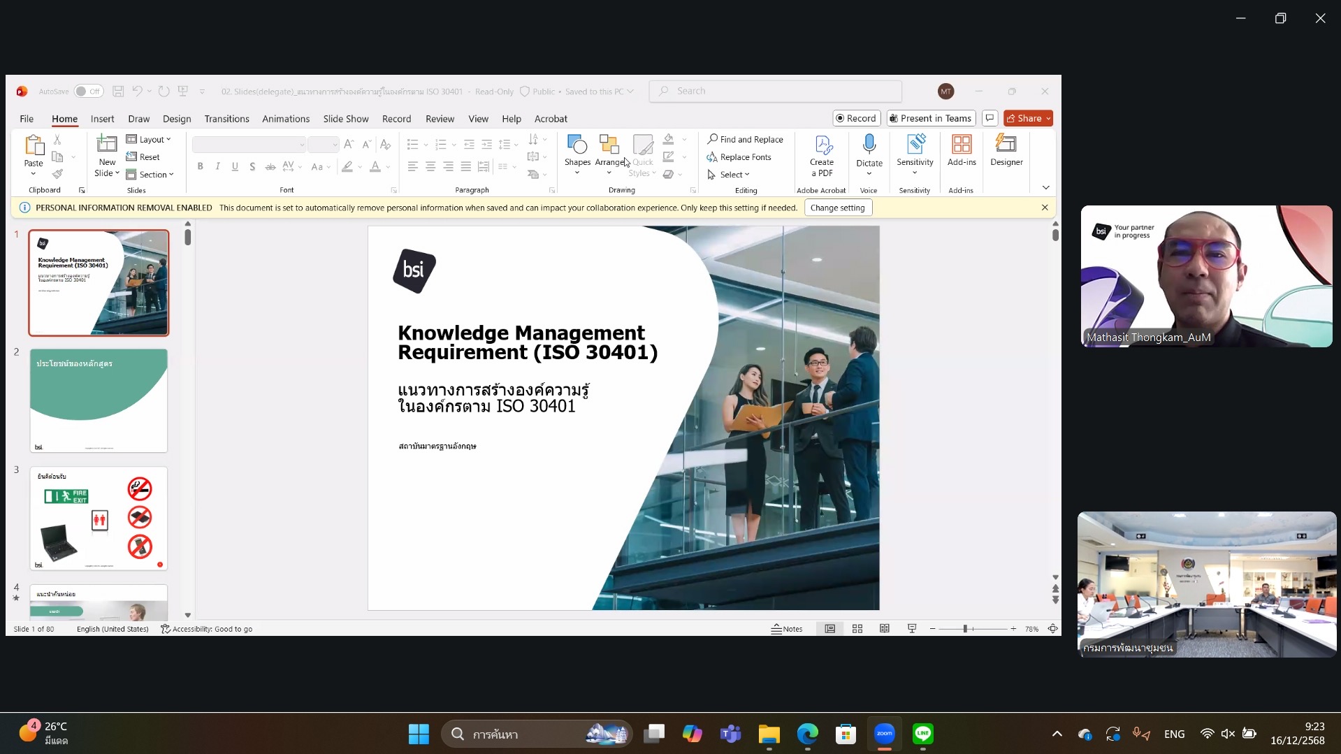 ทั้งนี้ สถาบันการพัฒนาชุมชน กรมการพัฒนาชุมชน ดำเนินกิจกรรมโครงการพัฒนามาตรฐานระบบการจัดการความรู้สากล (ISO) กิจกรรมที่ 1 ฝึกอบรมหลักสูตรมาตรฐานระบบการจัดการความรู้สากล โดยดำเนินการ วันที่ 16 – 18 ธันวาคม 2568 จำนวน 3 วัน รูปแบบออนไลน์ผ่านระบบ Zoom Cloud Meetings โดยมุ่งพัฒนาหน่วยงานให้พร้อมสําหรับการให้บริการทางวิชาการแก่หน่วยงานในเขตพื้นที่บริการได้อย่างมีประสิทธิภาพ ให้กับกลุ่มเป้าหมาย รวมจำนวน 111 คน ซึ่งประกอบด้วยบุคลากรสังกัดส่วนกลาง จำนวน 10 คน / สังกัดศูนย์ศึกษาและพัฒนาชุมชนอุดรธานี จํานวน 15 คน / สังกัดศูนย์ศึกษาและพัฒนาชุมชน จำนวน 10 แห่ง ๆ ละ 1 คน รวม 10 คน และสังกัดส่วนภูมิภาค ทุกจังหวัด จำนวน 76 คน ในการนี้ สถาบันการพัฒนาชุมชน ได้รับเกียรติจาก นายเมธาสิทธิ์ ทองคำ ผู้เชี่ยวชาญด้านมาตรฐานระบบการจัดการความรู้และผู้ตรวจประเมินสําหรับการรับรองมาตรฐาน ISO 30401 : 2018 จากบริษัท BIS Group จํากัด มาเป็นวิทยากรบรรยาย ให้ความรู้พร้อมแลกเปลี่ยนซักถามและยกตัวอย่างกรณีศึกษาให้กับกลุ่มเป้าหมายเพื่อสร้างความรู้ ความข้าใจเกี่ยวกับข้อกำหนดต่างๆ ตามมาตรฐานการจัดการความรู้ ISO 30401 : 2018 อีกด้วย